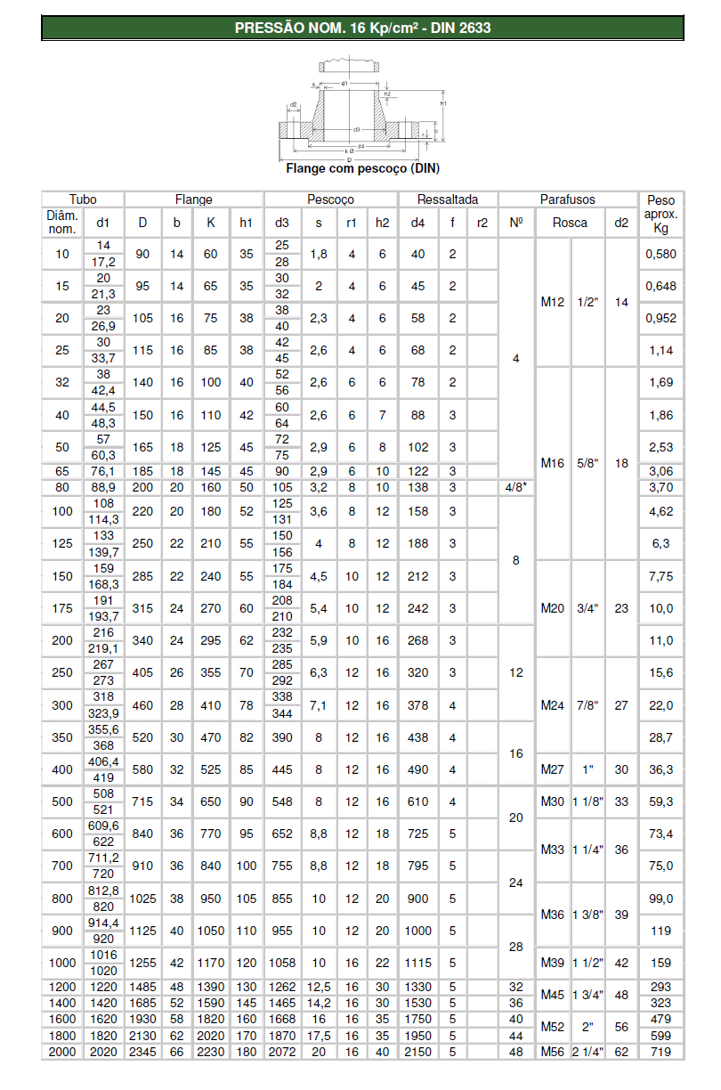 FLANGES COM PESCOÇO - PRESSÃO NOMINAL 16 K / CM2 - DIN 2633